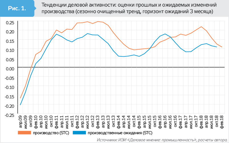 Анализ тенденций, построенных на основе сезонно очищенного индекса изменений объемов производства и индекса ожидаемых изменений объемов производства, свидетельствует о замедлении темпов роста во второй половине 2018 г. Результаты двух последних замеров делового мнения в 2018-м (в июле и октябре) при переводе в сезонно очищенный тренд снова демонстрируют замедление. Таковы результаты ежеквартального опроса руководителей 300 промышленных предприятий "Деловое мнение" Института экономических исследований и политических консультаций.