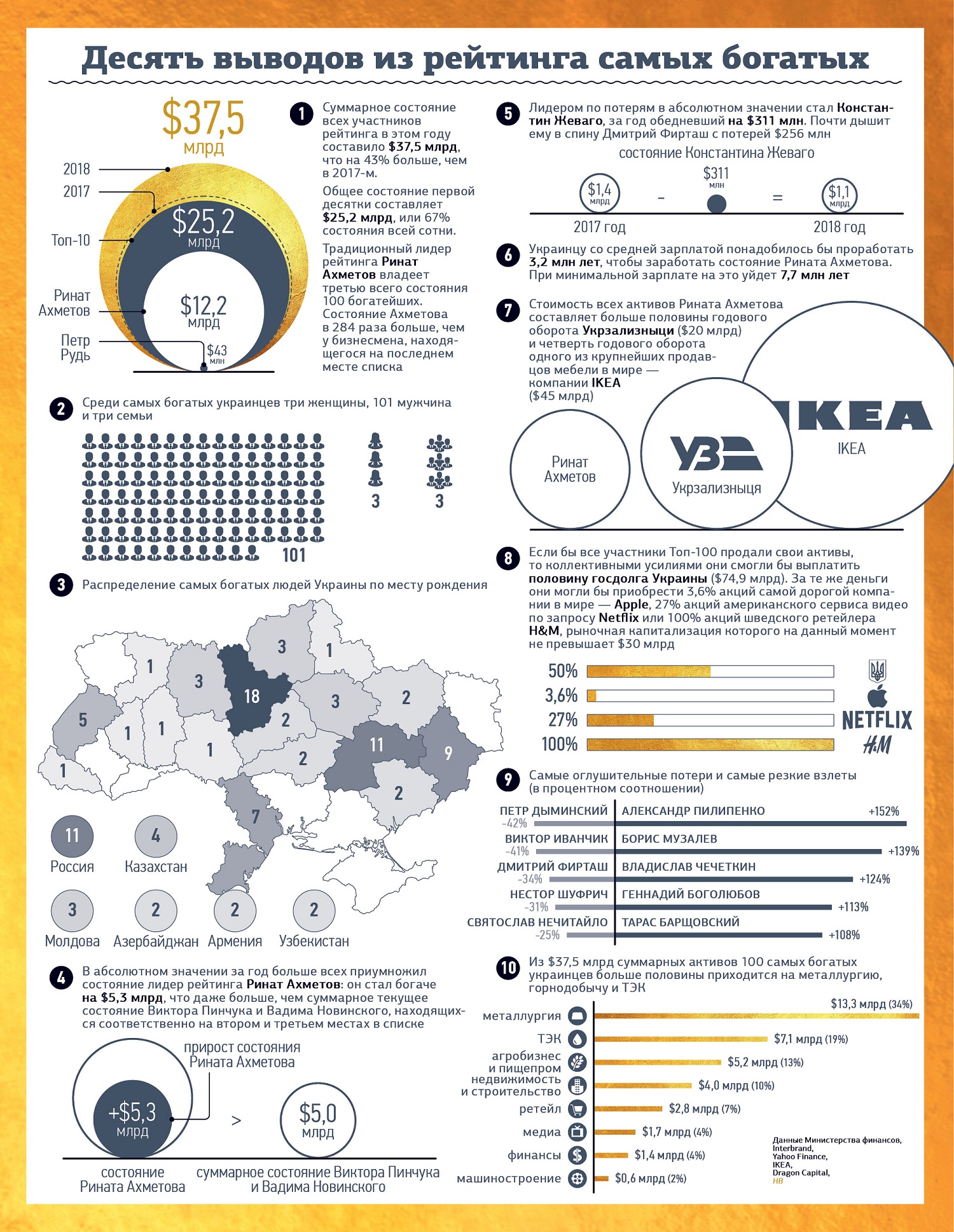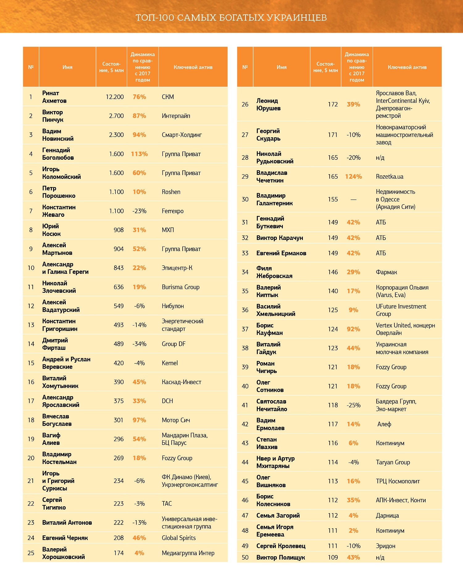 Больше всех воспользовался рыночной конъюнктурой Ринат Ахметов, который в очередной раз возглавил рейтинг самых богатых соотечественников. Благодаря растущему спросу на металлы его состояние за год выросло сразу на 76 %. А если говорить в абсолютных цифрах, то владелец СКМ стал богаче на $ 5,3 млрд. Таким образом Ринат Ахметов владеет третью всего состояния топ-100 богатейших украинцев. А еще оно в 284 раза больше, чем у бизнесмена, находящегося на последнем месте в топ-100.