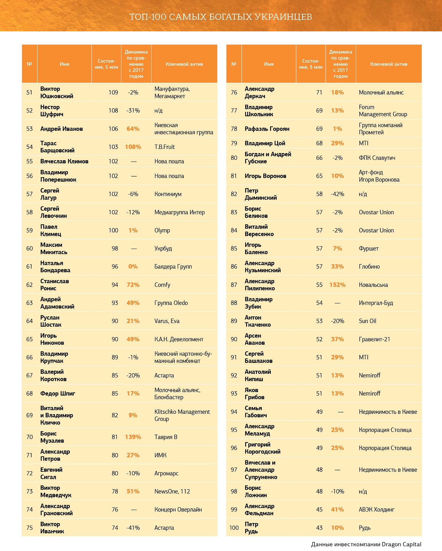 Еще одна пара новичков– Вячеслав Климов и Владимир Поперешнюк, капиталы каждого из которых Dragon Capital оценил в $ 102 млн. Бизнесмены отличаются от подавляющего большинства участников рейтинга тем, что создали свое предприятие с нуля и без участия в приватизационных конкурсах.