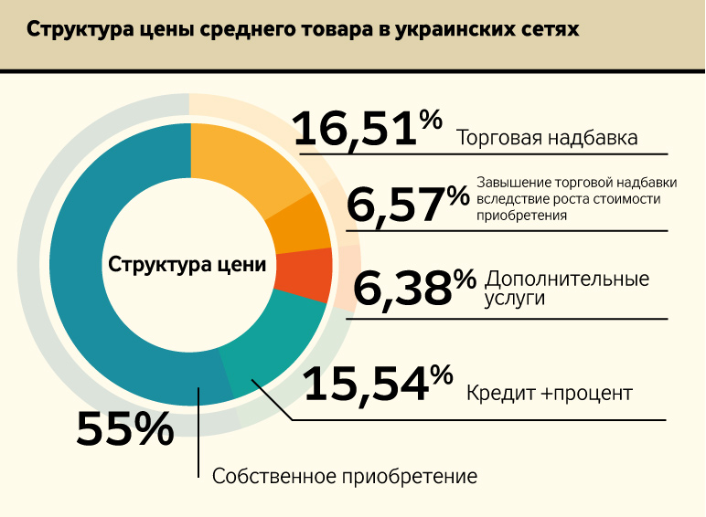 Нам говорят: таким фактором стала ложная статистика. Возможно, частично так, но не на столько же! Таким маховиком оказались субъективные факторы. Когда мы проанализировали структуру цены на средний товар в торговых сетях, то выяснили, что 55% - это собственно приобретение товара, 15 - торговая надбавка. А 30% - средства, которые получают через возможность ограничивать конкуренцию и навязывать ненужные дополнительные услуги, существенно задерживать платежи за уже реализованные товары, контролировать цены, по которым поставляются товары конкурентам, а также перекладывать риски своей деятельности на поставщиков. Объясните мне, почему поставщик должен платить за уборку магазина или за внесение информации о товаре в электронные базы сети, или же за возвращение своевременно нереализованного товара?" - задается вопросом и.о. главы АМКУ.