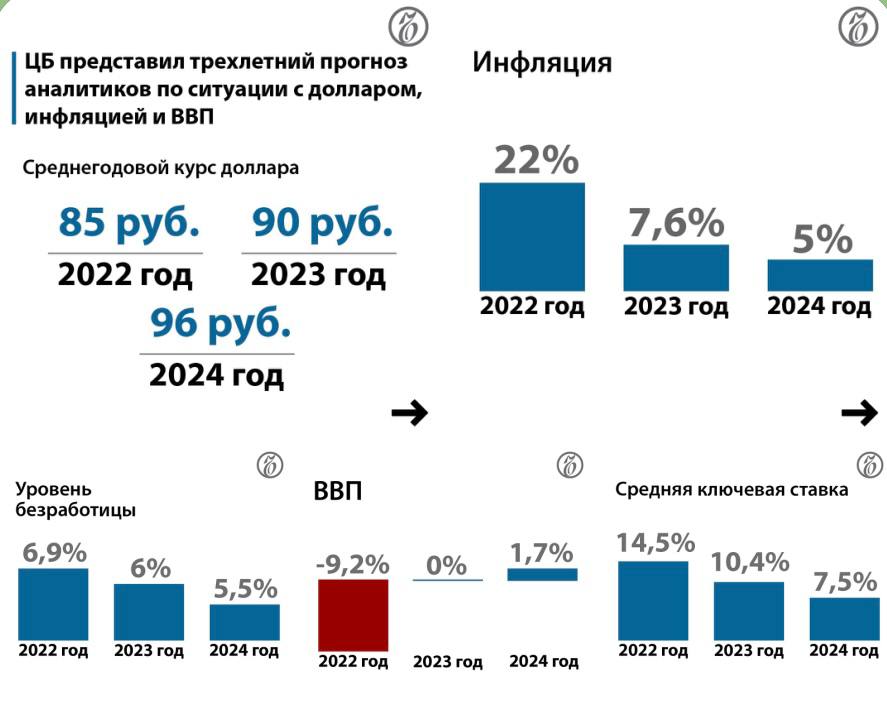 Согласно прогнозу, инфляция в 2022 году будет на уровне 22%, падение ВВП (экономики) – 9,2%, средний годовой курс доллара – 90 руб.