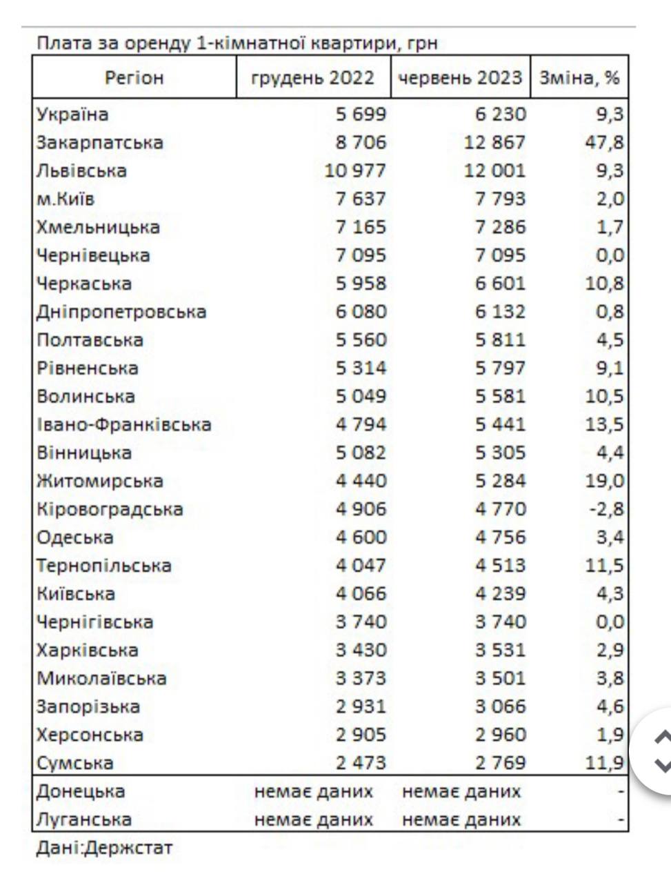 - Закарпатская область, рост аренды составил 47,8% до 12867 гривен;