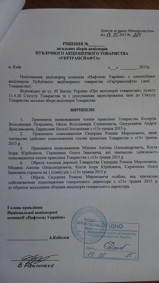 Решением общего собрания акционеров ПАО "Укртранснафта" 13 мая были составе уволены члены правления компании и и.о. главы компании Роман Сидорак. Дирекцию "Укртранснфаты" назначили, а Сидорак стал временным исполняющим обязанности гендиректора компании с 13 мая.