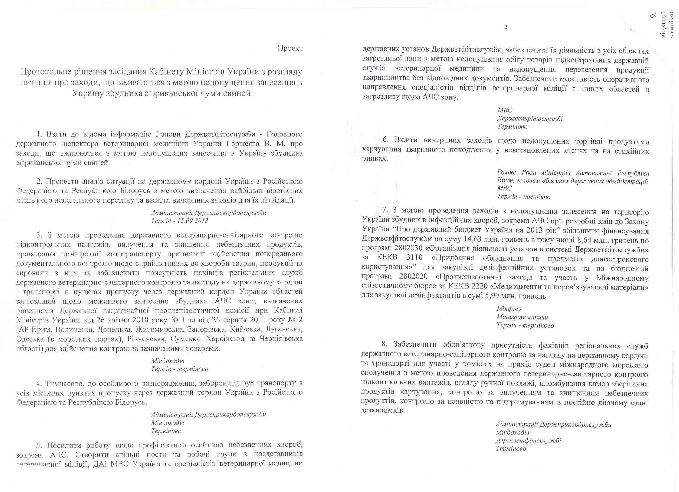 МВД и Госветфитослужбе предлагается усилить работу относительно профилактики особо опасных заболеваний, в т.ч. АЧС, и создать совместные посты и рабочие группы для недопущения оборота товаров, подконтрольных госслужбе ветеринарной медицины, и недопущения перевозки товаров животноводства без соответствующих документов.