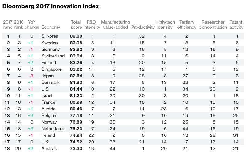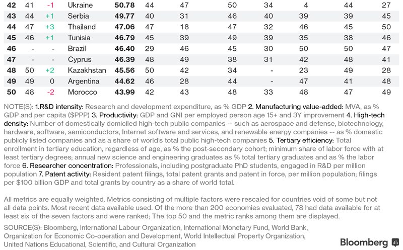 Украина по итогам 2016 года заняла 42 место в рейтинге стран с самой инновационной экономикой по версии агентства Bloomberg. По сравнению с 2015 годом Украина опустилась в рейтинге на одну позицию ниже, год назад наша страна была на 41-м месте.