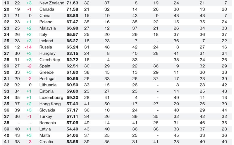 Что касается всего ТОП-50, то возглавила общий рейтинг Южная Корея, сохранившая свои прошлогодние позиции. В первую десятку ведущих инновационных экономик мира также вошли Германия, Швеция, Финляндия, Швейцария, Сингапур, Япония, Дания, США и Израиль.