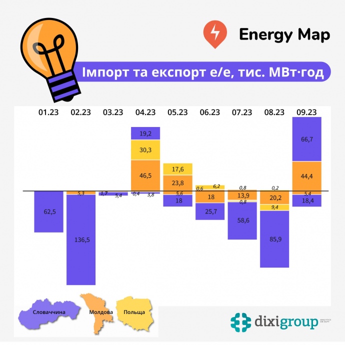В то же время импорт за прошедший месяц достиг 23,8 тыс. МВт-ч: 77% (18,4 тыс. МВт-ч) поступило из Словакии; 23% (5,4 тыс. МВт-ч) — из Молдовы. Следовательно, экспорт электроэнергии почти в пять раз превысил импорт в сентябре. Благо, что дорогостоящую аварийную помощь в сентябре Украина не привлекала.