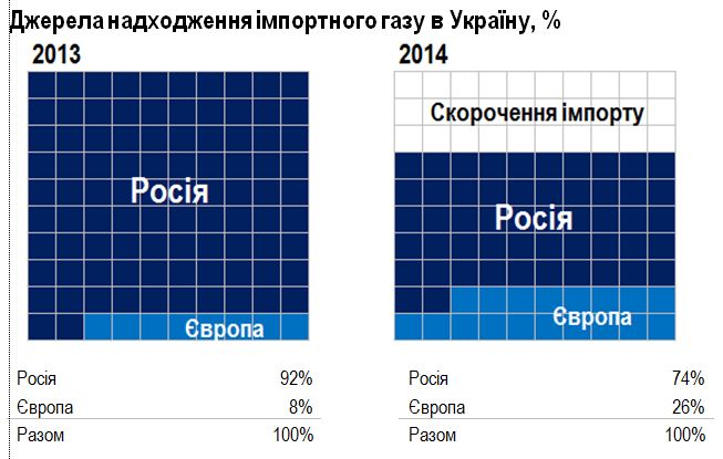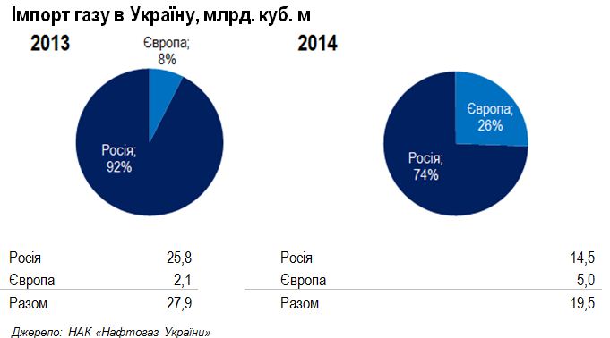 Украина за 2014 год сократила импорт газа из Российской Федерации в 1,8 раза (с 25,8 до 14,5 млрд куб. м).