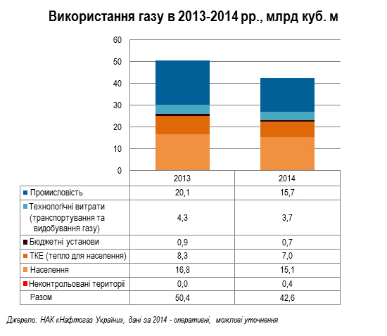 Приведенные объемы использования газа включают данные из АР Крым за 12 месяцев 2013 года (1,7 млрд куб. м) и 2 месяца 2014 года (0,5 млрд куб. м). Без учета этих данных использование газа на остальной территории Украины сократилось на 14%, в том числе по категориям потребителей: промышленность - на 15% до 16,1 млрд куб. м, население - на 7% до 15,0 млрд куб. м, предприятия ТКЭ - на 8% до 7,0 млрд куб. м.