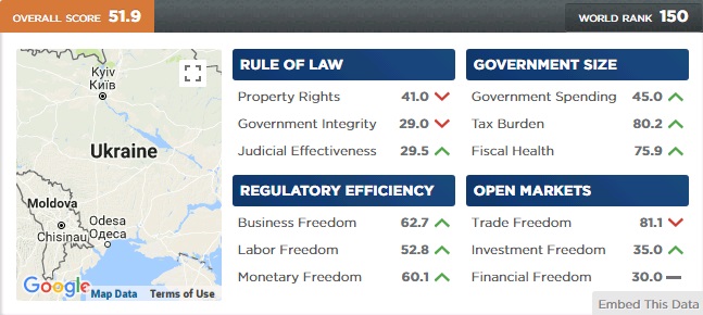 Украина заняла последнее, 44 место в Европе и 150-е из 186 стран мира в рейтинге экономических свобод, составленном американским аналитическим центром Heritage Foundation.