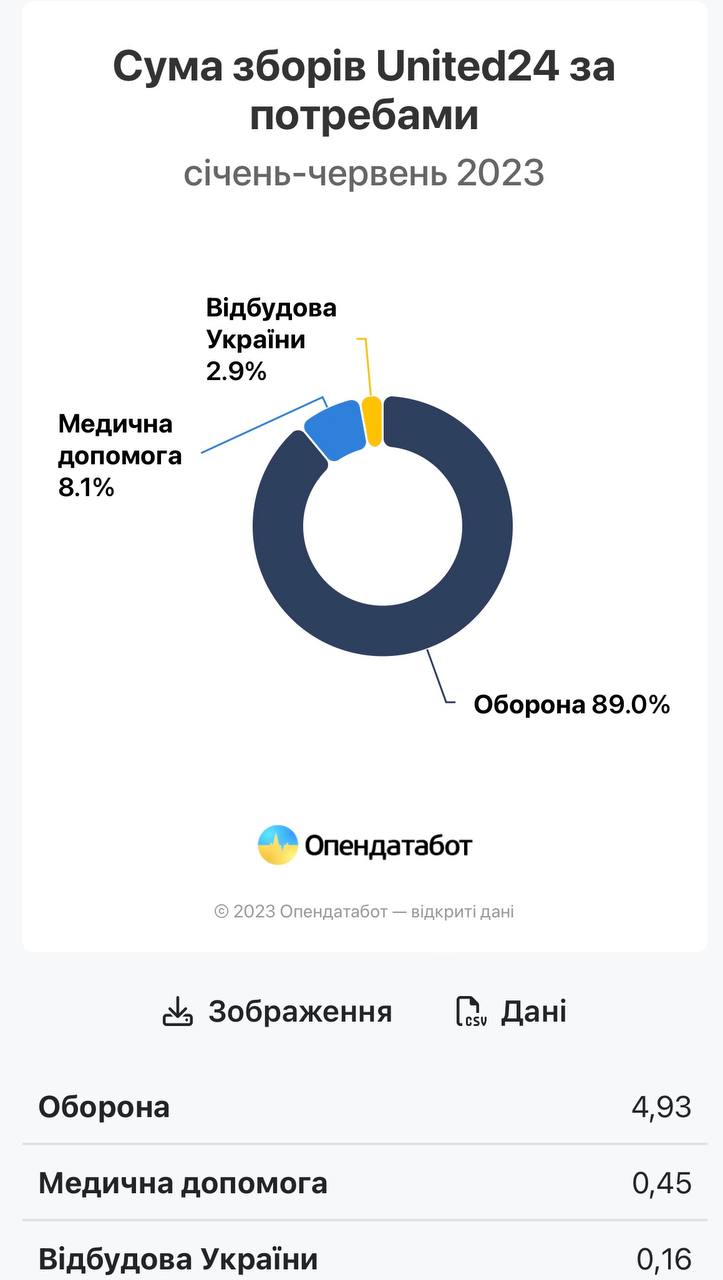 Уточняется, что 2,4 млрд гривен United24 на оборону в июне - это абсолютный рекорд и почти половина всех донатов на оборону в первом полугодии текущего года. При этом результаты сборов на ВСУ за июнь в 4,8 раза превысили показатели периода января-мая текущего года — тогда United24, в среднем, собирала на эти нужды 0,5 млрд гривен в месяц.