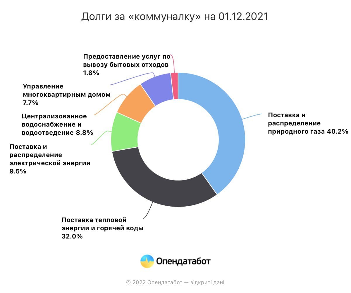 - задолженность по оплате коммунальных услуг — + 41% или +140 тысяч долгов за 2021 год, а за два года — более чем вдвое. Общий долг на 01 декабря 2021-го составляет 72,7 млрд грн;