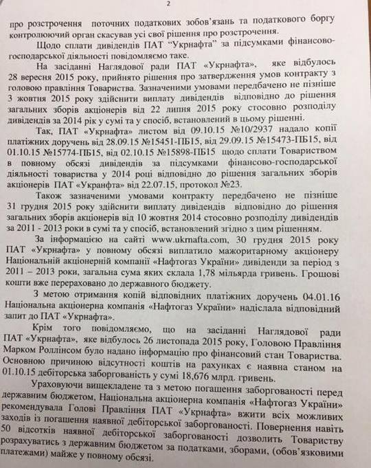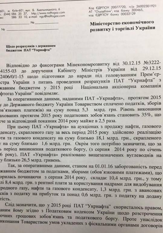 "Задолженность перед государственным бюджетом по налогам, сборам, образовавшаяся начиная с августа 2014 года по состоянию на 1 января 2016 года составляет 10,4 млрд грн, в том числе 8,4 млрд грн рентной платы за пользование недрами для добычи газа, нефти и газового конденсата, 1,3 млрд грн из авансовых взносов по налогу на прибыль и более 0,6 млрд грн по налогу на добавленную стоимость", - сообщается в письме.