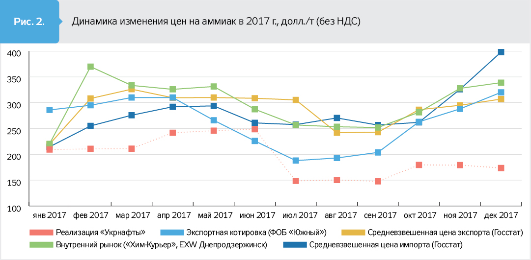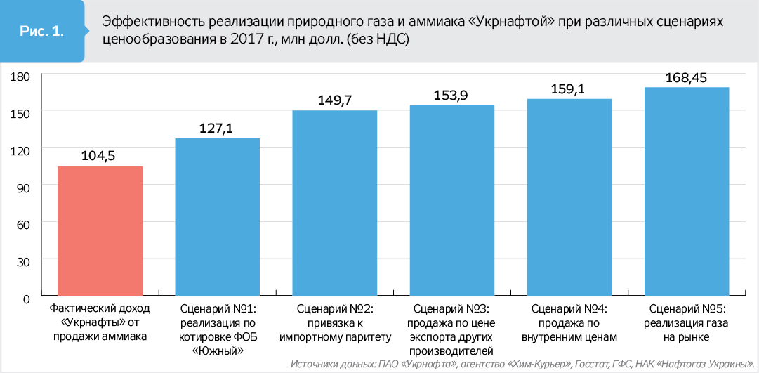 "Динамика цен на аммиак в 2017 г. показывает, что никакой зависимости между ценами продажи "Укрнафты" и рыночными индикаторами не было. Видно другое: договаривались каждый месяц так, как было выгодно "Днепразоту", а не "Укрнафте", - отмечают эксперты. - В апреле "Укрнафта" продала 8 млн кубометров газа по рыночной цене на аукционе. Где остальные 75 млн кубометров, почем проданы они и, что немаловажно, получены ли за них деньги - тайна за семью печатями. А кто ответит за "подвиги" по продаже аммиака в 2017-м и раньше? Непрофессионализм или саботаж менеджмента "Укрнафты" по работе с "Днепразотом" в 2017 г. стоил добывающей компании от 22,6 до 63,9 млн долл. (0,61–1,7 млрд грн, без НДС).