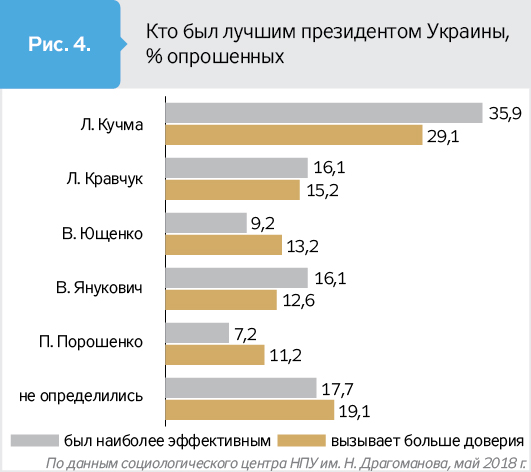 "Следовательно, период президентства Л.Кучмы для экономики был самым динамическим в плане преодоления кризиса, осуществления реформ и обеспечения роста. Л.Кучма принял Украину с самым большим спадом экономики, а передал - с самым высоким ее ростом, - отмечает автор. - Характерно, что такие экономические результаты деятельности президентов Украины адекватно воспринимаются гражданами, о чем свидетельствуют результаты опроса на тему: "Кто был лучшим президентом Украины?".У Л.Кучмы получается самая высокая оценка доверия и значительно выше рейтинг эффективного президента".