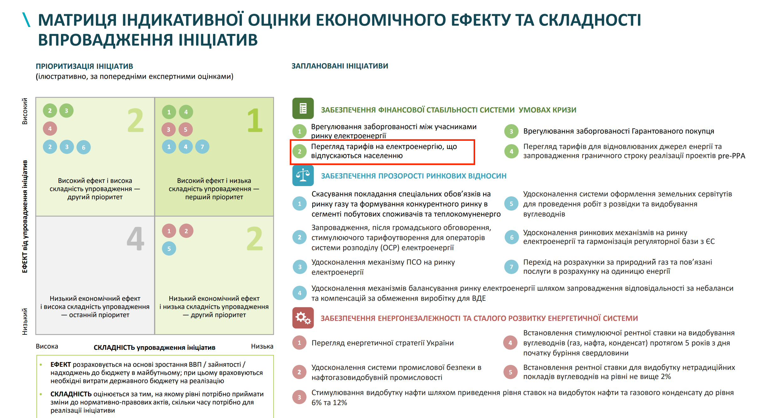 Также среди запланированных инициатив в этой сфере: урегулирование задолженности Гарантированного покупателя, пересмотр тарифов для возобновляемых источников энергии и урегулирование задолженности между участниками рынка.