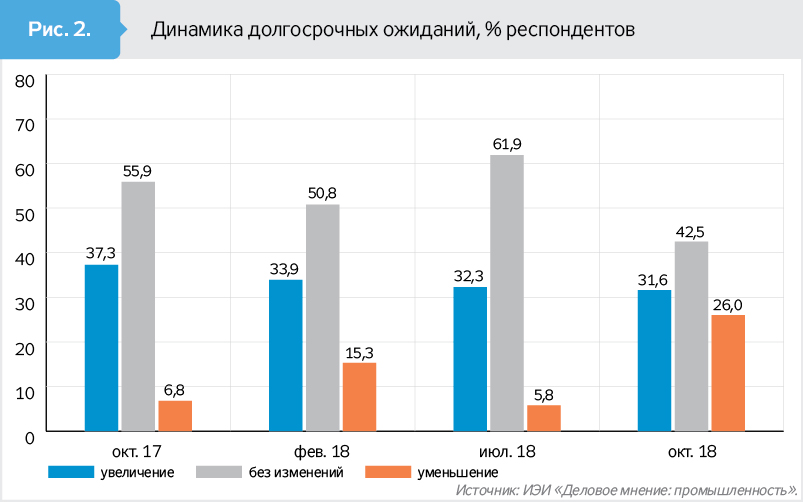 В долгосрочных ожиданиях бизнеса оптимистические прогнозы доминируют над пессимистическими, хотя разница между ними резко уменьшилась в октябре 2018 г. Впервые вопрос о перспективах деловой активности за два года был задан в октябре 2017-го, тогда 37,3% опрошенных планировали расширение деловой активности в перспективе двух лет, и только 6,8% прогнозировали ее уменьшение. Балансовый показатель составил +30,5%. Затем на протяжении 2018 г. значение этого показателя уменьшалось и в октябре 2018-го достигло значения +5,6%. Это произошло в основном за счет существенного роста доли тех, кто прогнозирует уменьшение своей деловой активности в следующие два года. Так, 31,6% опрошенных планируют расширить деловую активность через два года, а 26% - планируют ее уменьшить. Таковы результаты ежеквартального опроса руководителей 300 промышленных предприятий "Деловое мнение" Института экономических исследований и политических консультаций.