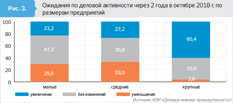 "Ожидания крупных предприятий существенно отличаются от ожиданий малых и средних. Среди первых только 3,8% сообщили, что планируют сократить деятельность в следующие два года, а 60,4% руководителей крупных предприятий сообщили о планах расширить деятельность. При этом почти треть малых и средних предприятий ожидают уменьшения своей деловой активности в следующие два года. Подытоживая приведенный выше анализ, отметим, что, вопреки доминированию положительных прогнозов, динамика самих трендов свидетельствует о неустойчивости роста", - отмечает эксперт.