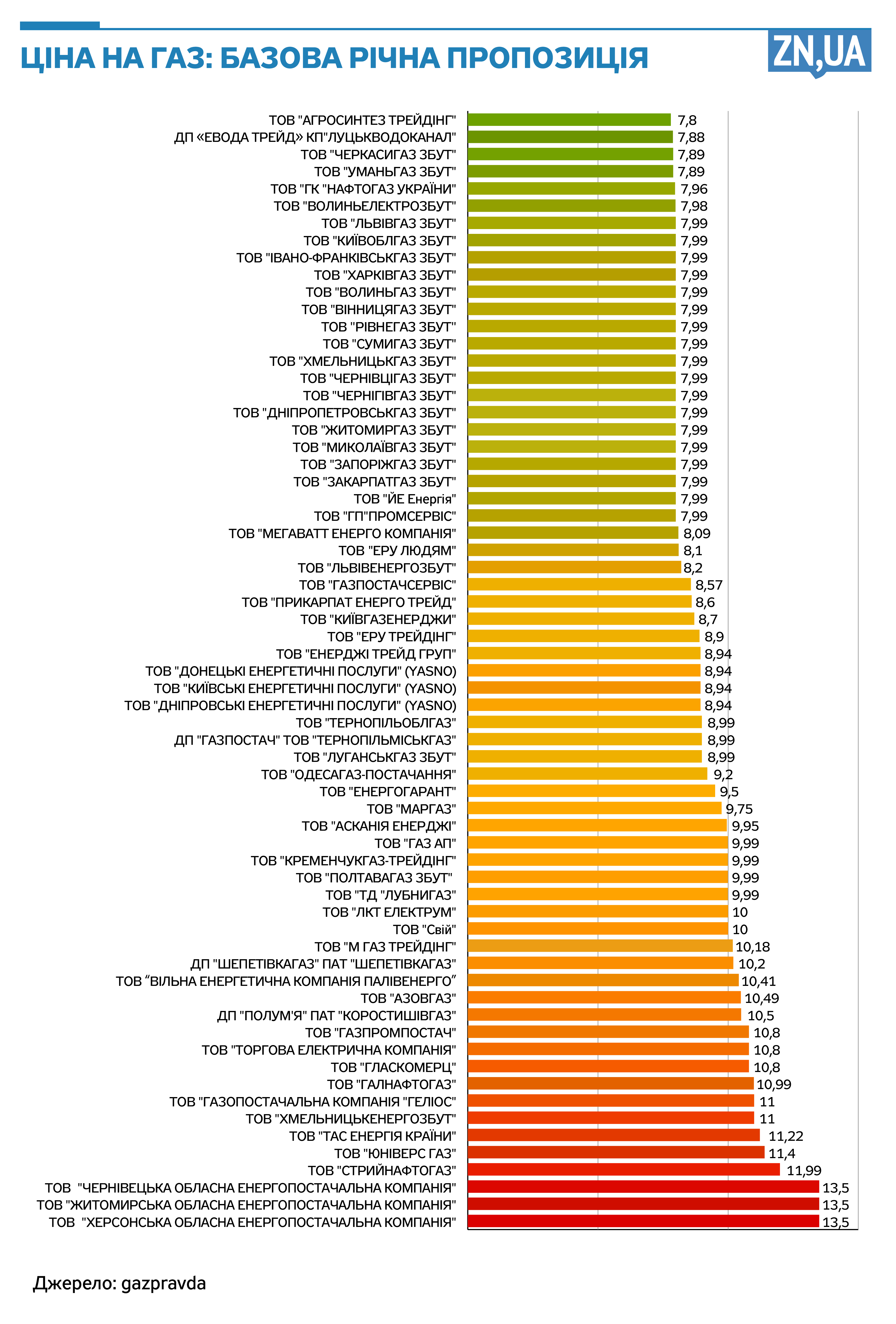 При этом самые низкие цены предложили: "Агросинтез Трейдинг" (7,80 грн за кубометр), "Эвод Трейд КП Луцкводоканал" (7,88 грн за кубометр), "Черкассыгаз Сбыт" и "Уманьгаз Сбыт" (7,89 грн за кубометр), а также "Газоснабжающая компания "Нафтогаз Украины" (7,96 грн за кубометр).