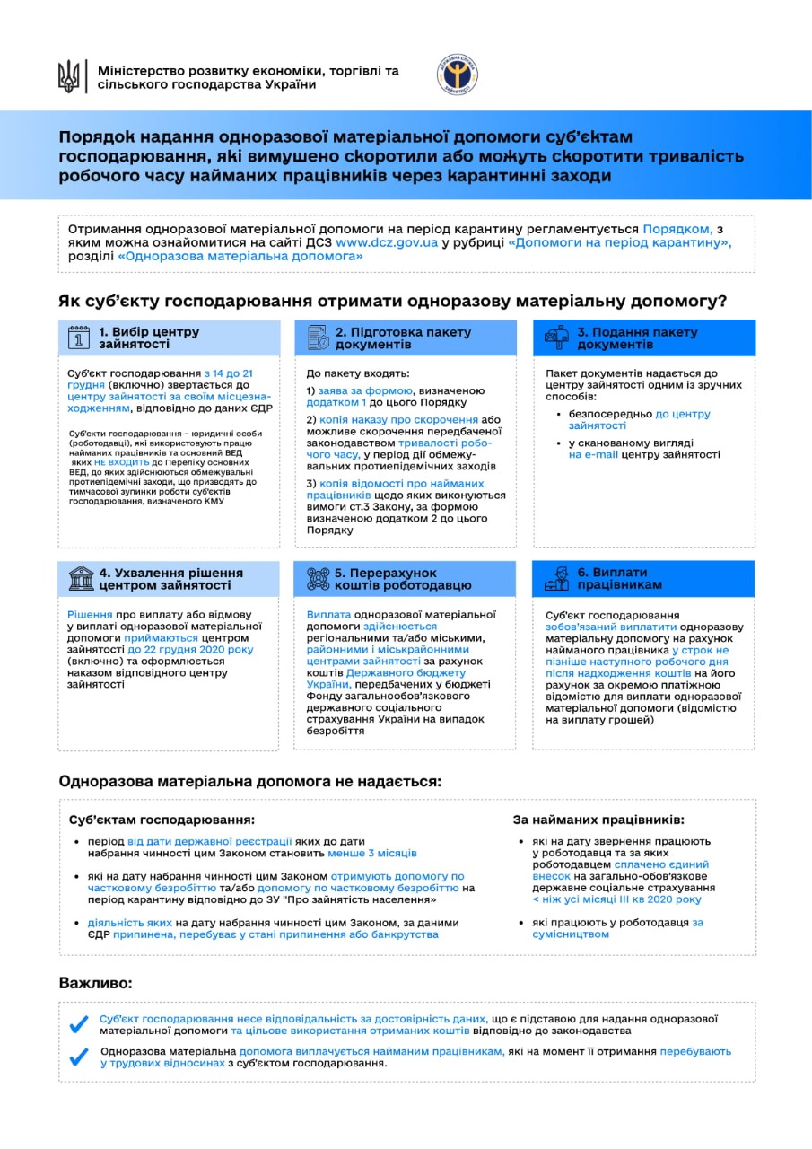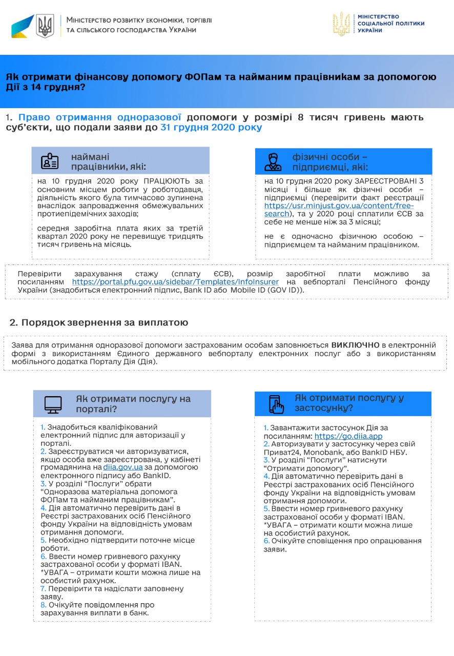 Напомним, 7 декабря президент Владимир Зеленский подписал принятый Верховной Радой закон "О социальной поддержке застрахованных лиц и субъектов хозяйствования на период осуществления ограничительных противоэпидемических мероприятий, введенных с целью предотвращения распространения на территории Украины острой респираторной болезни COVID-19, вызванной коронавирусом SARS-CoV-2" № 1071-IX, который предусматривает предоставление единовременной материальной помощи в размере 8 тыс. грн наемным работникам, которые потеряли часть заработной платы вследствие введения карантина, и физическим лицам-предпринимателям (ФОП), которые потеряли часть дохода вследствие карантина.