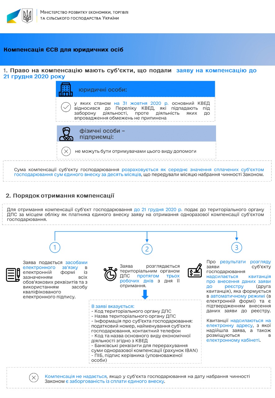 Кроме того, закон предусматривает единовременную компенсацию субъектам хозяйствования с целью возмещения расходов, понесенных на уплату единого взноса (ЕСВ) на общеобязательное государственное социальное страхование.