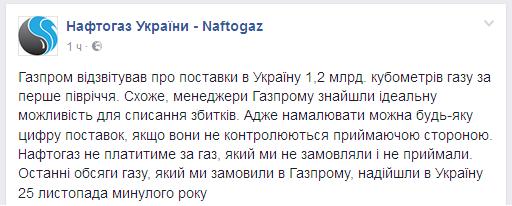 "Похоже, менеджеры "Газпрома" нашли идеальную возможность для списания убытков. Ведь нарисовать можно любую цифру поставок, если они не контролируются принимающей стороной", – отметили в "Нафтогазе" в записи на странице компании в Facebook.