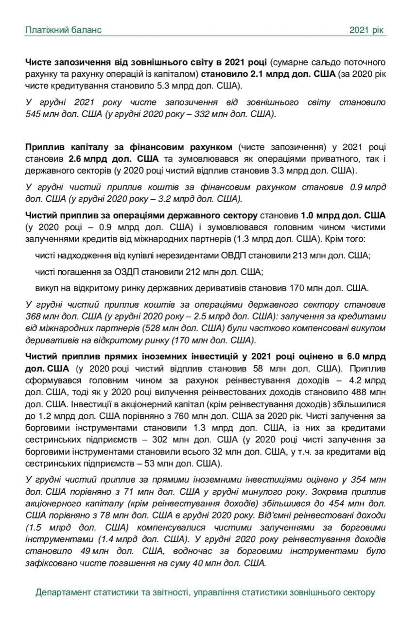 По итогам 2021 года чистый приток прямых иностранных инвестиций достиг 6,0 млрд долларов США. При этом чистый отток в 2020 году составил 58 млн долларов. Об этом говорится в Платежном балансе Национального банка Украины (НБУ).