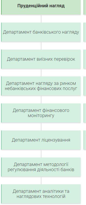Вертикаль «пруденциального надзора» присоединено к вертикали «Общий блок». В результате создана вертикаль «пруденциального надзора и общие вопросы». К ней дополнительно отнесены департаменты банковского надзора, выездных проверок, лицензирования, финансового мониторинга, аналитики и надзорных технологий, надзора за рынком небанковских финансовых услуг. Кирилл Шевченко, глава Нацбанка, будет осуществлять общее руководство и контролировать деятельность подразделений, отнесенных к вертикали «пруденциального надзора и общие вопросы».