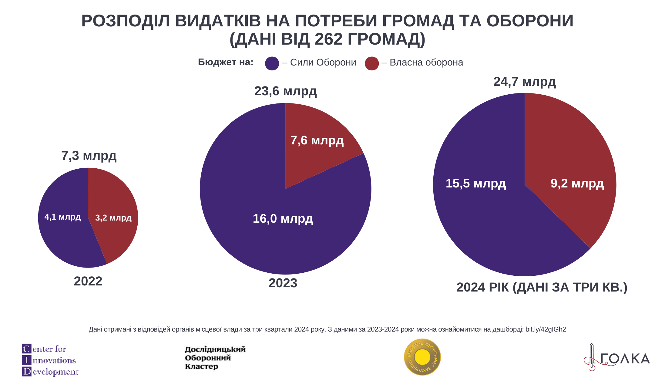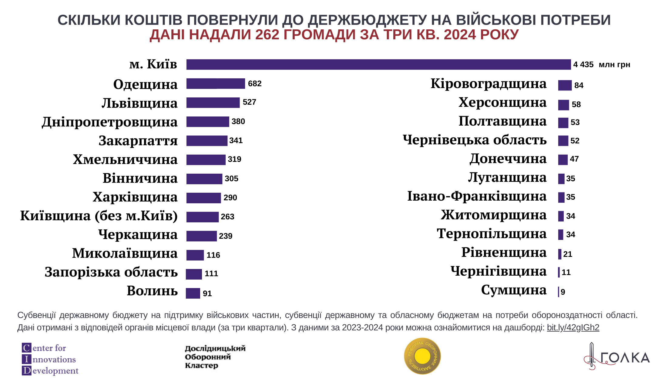 Всего в течение прошлого года 262 громады, опрошенные в рамках исследования Центра развития инноваций и общественной инициативы «Голка», выделили из местных бюджетовоколо 25 млрд грн на потребности громад и сил обороны. Из них около 9 млрд — на собственные нужды и оборону громад, а 15 млрд — на силы обороны в целом. Поэтому общая сумма по Украине значительно больше. По меньшей мере, опрошенные громады выделили на оборону 0,01% своего годового бюджета, а больше всего – 24,3%.