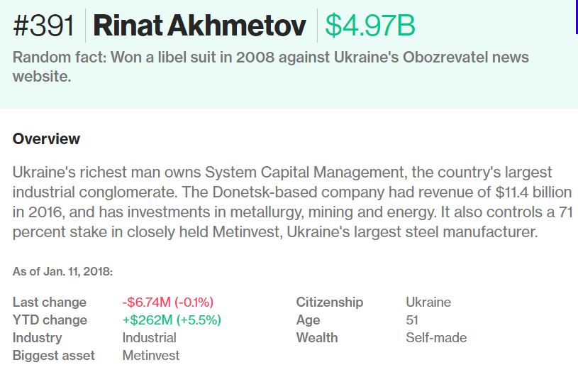 Украинский олигарх Ринат Ахметов оказался единым украинцем, который попал в рейтинг самых богатых людей мира американского издания Bloomberg топ-500. По данным аналитиков, только с сентября он поднялся с 439 на 393 место.