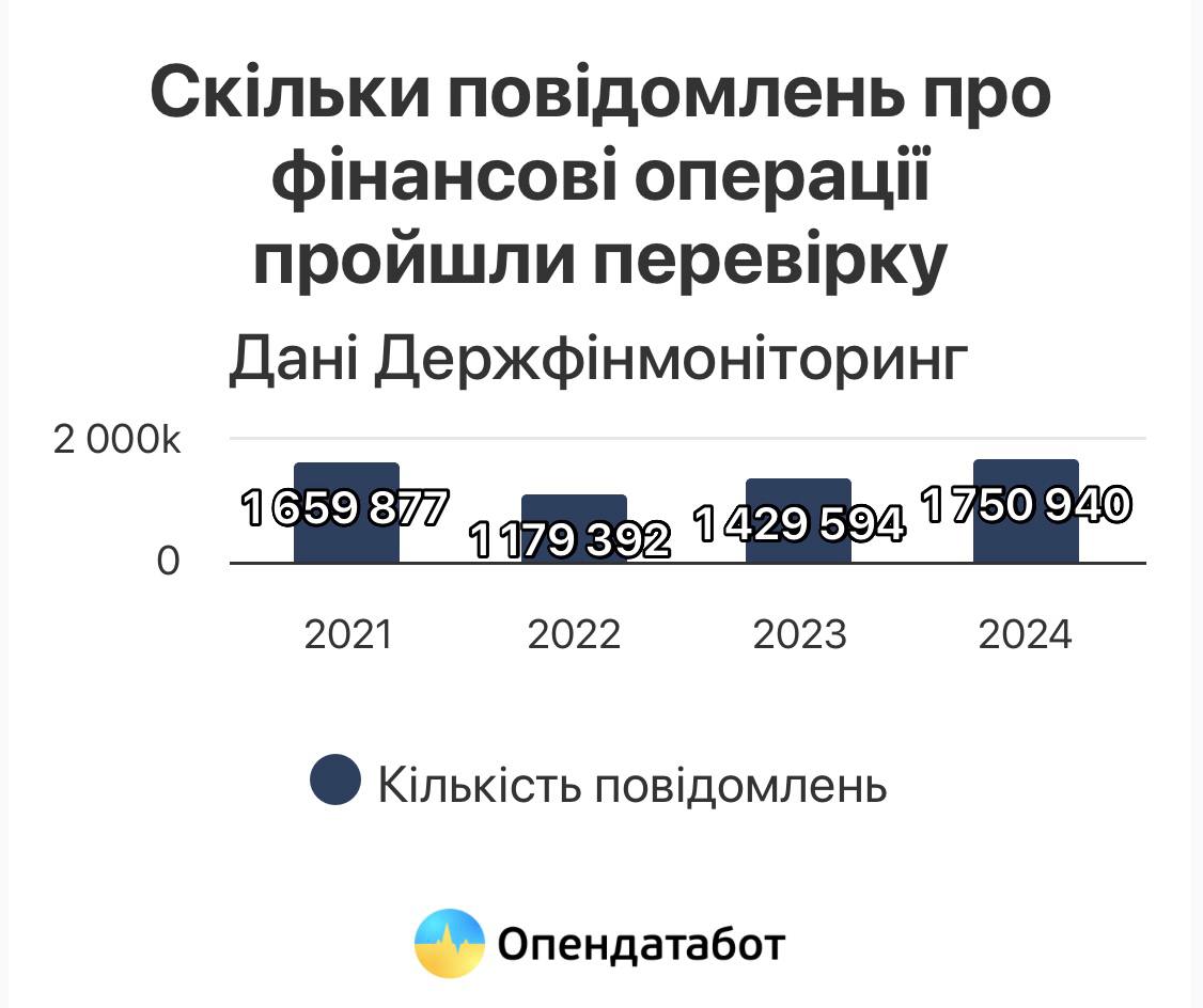 Государственная служба финансового мониторинга (Финмониторинг) в течение 2024 года получила от украинских банков и небанковских финучреждений 1750940 сообщений о подлежащих мониторингу финансовых операциях. Это на 23% больше, чем годом ранее. Об этом сообщает Опендатабот.