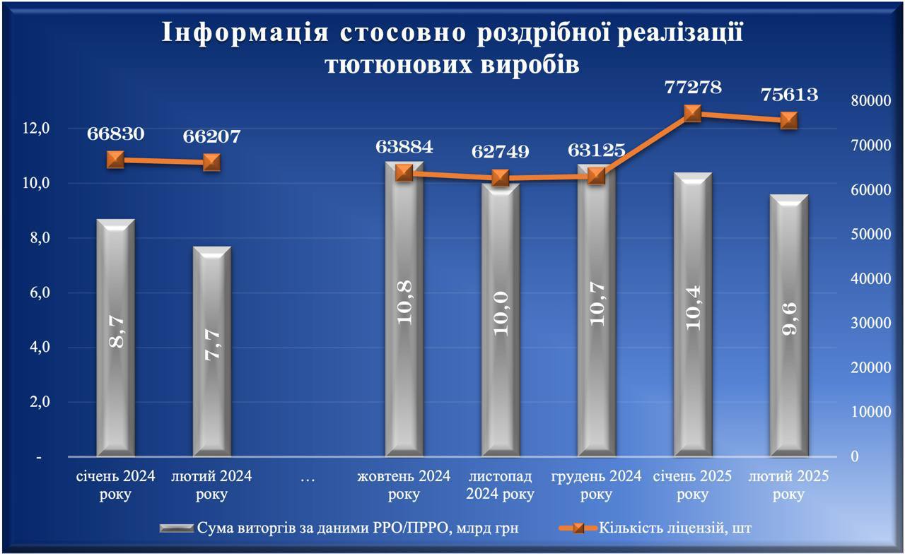 В феврале 2025 года выручка от продажи табачных изделий составила 9,6 млрд грн, что на 8% (800 млн грн) меньше, чем в январе. По сравнению с декабрем 2024 падение еще более впечатляющее — на 42 500 грн на одну лицензию. В целом средняя выручка на одну лицензию в феврале составила 127 000 грн, что на 7600 грн ниже январского показателя.