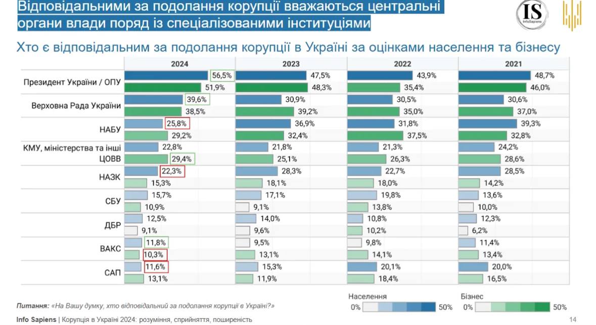 В прошлом году рост коррупции отмечали 57% бизнеса, что на 10 п.п. больше, чем в 2023 году. Такие данные содержит исследование "Коррупция в Украине 2024: понимание, восприятие, распространенность" исследовательского агентства Info Sapiens по заказу Национального антикоррупционного бюро.