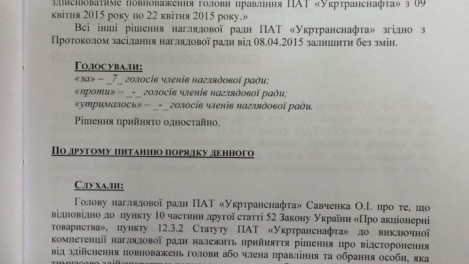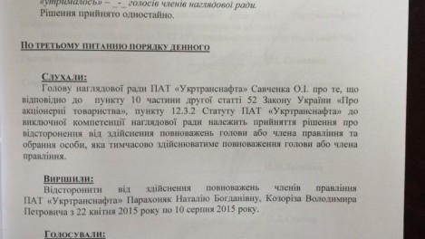 Кроме того, на заседании было принято решение об отстранении от осуществления полномочий членов правления "Укртранснафты" Натальи Парахоняк и Владимира Козорина с 22 апреля по 10 августа 2015 года.