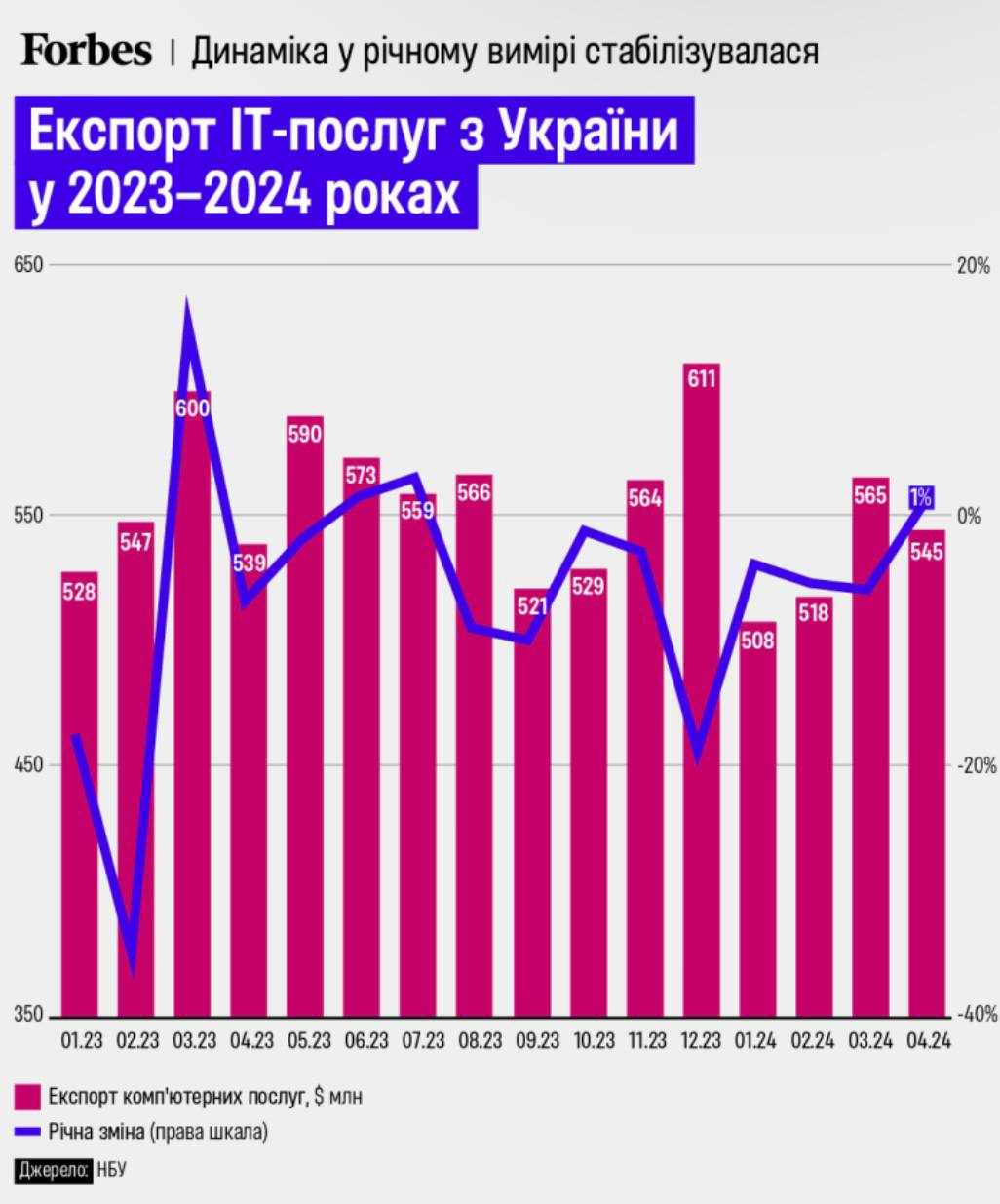Объем экспорта украинских IT-услуг в апреле по сравнению с предыдущим месяцем (мартом) упал на 3,5% и составил $545 млн. Об этом свидетельствуют данные Нацбанка, передает Forbes.