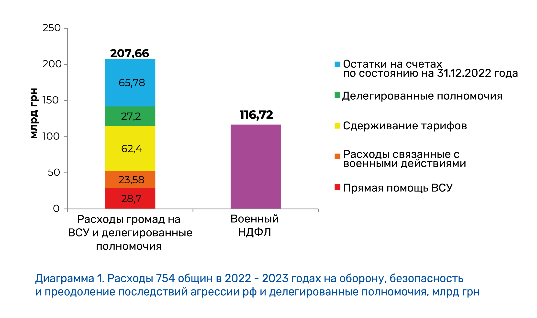 Прямые расходы на безопасность и оборону, расходы из-за военной агрессии, оплаченные из местных бюджетов делегированные полномочия и сдерживание тарифов, а также остатки средств на счетах 754 громад по состоянию на 31.12.2022 года составляют вместе уже сегодня 207,66 млрд грн. Хотя военного НДФЛ за два года запланировано 116,72 млрд грн.