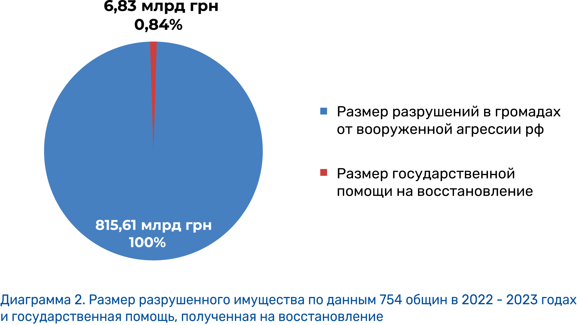 Прежде чем делать общий вывод, посмотрим убытки 754 громад от действий агрессора в размере 815,61 млрд грн и помощь, полученную муниципалитетами из государственного бюджета, в сумме 6,83 млрд грн для восстановления этих объектов.