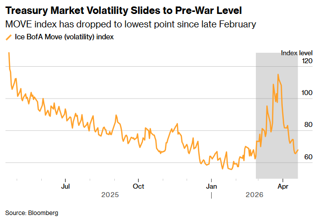 Рынок американских казначейских облигаций вошел в период необычного спокойствия. Двухнедельное перемирие между США и Ираном, срок которого изначально истекал в среду, однако президент Дональд Трамп продлил его до завершения переговоров, помогло снизить нефтяные цены с многолетних максимумов и опустило волатильность на рынке гособлигаций до уровней, предшествовавших началу военного противостояния. Трейдеры не просто наблюдают за этим: они активно ставят на то, что затишье продолжится, сообщает Bloomberg.