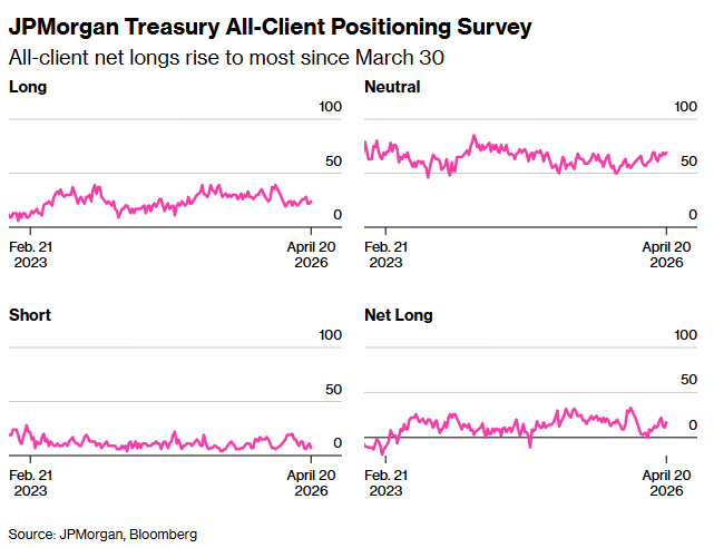 Согласно еженедельному опросу клиентов JPMorgan за период до 20 апреля, настроения крупных инвесторов стали заметно «бычьими»: