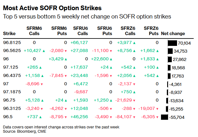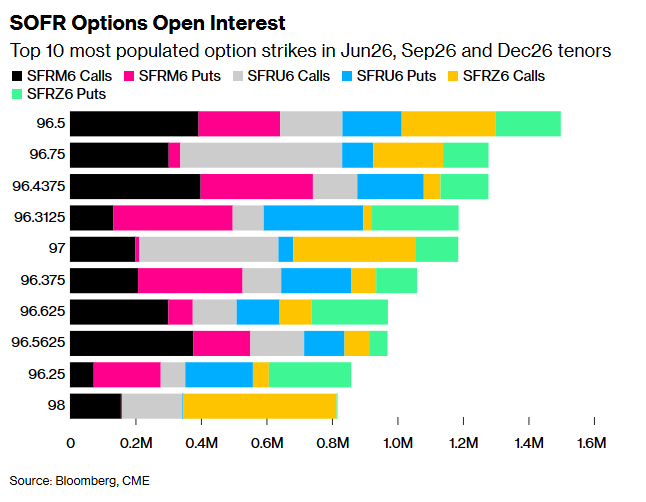 В сегменте SOFR-опционов (производных инструментов, привязанных к ставке SOFR — ключевому ориентиру стоимости краткосрочных долларовых займов и косвенному индикатору ожиданий по ставке ФРС) зафиксированы крупные новые позиции на страйке 96,8125 по контрактам на июнь, сентябрь и декабрь 2026 года. Активно торговались кол-флаи (call flies), рисковые развороты (risk reversals) и пут-спреды: все это опционные стратегии, позволяющие делать ставки на определенный диапазон ставок с ограниченным риском. Наиболее заполненным страйком по всем трем срокам остается уровень 96,50.