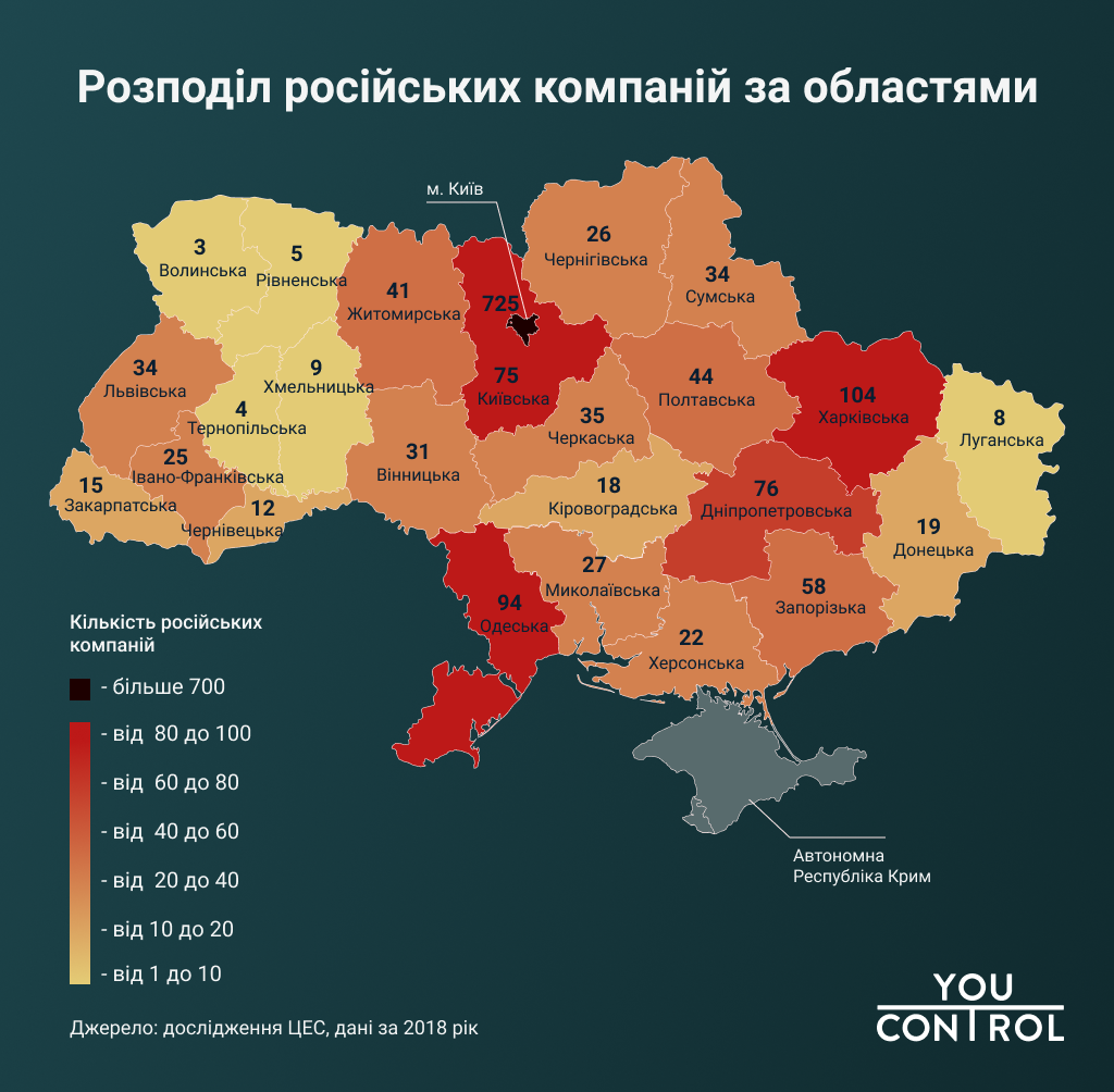 «Несмотря на военные действия между Украиной и Россией и многочисленные санкции, введенные против российских компаний в Украине, а также ограничений на работу украинских компаний в России, многие украинские компании остаются связанными с Россией. Они либо принадлежат россиянам, или же являются учредителями предприятий в России», - говорится в материале исследования. Подчеркивается, что больше компаний, которые основывают компании в России, из Киева, таких согласно данным — 210.