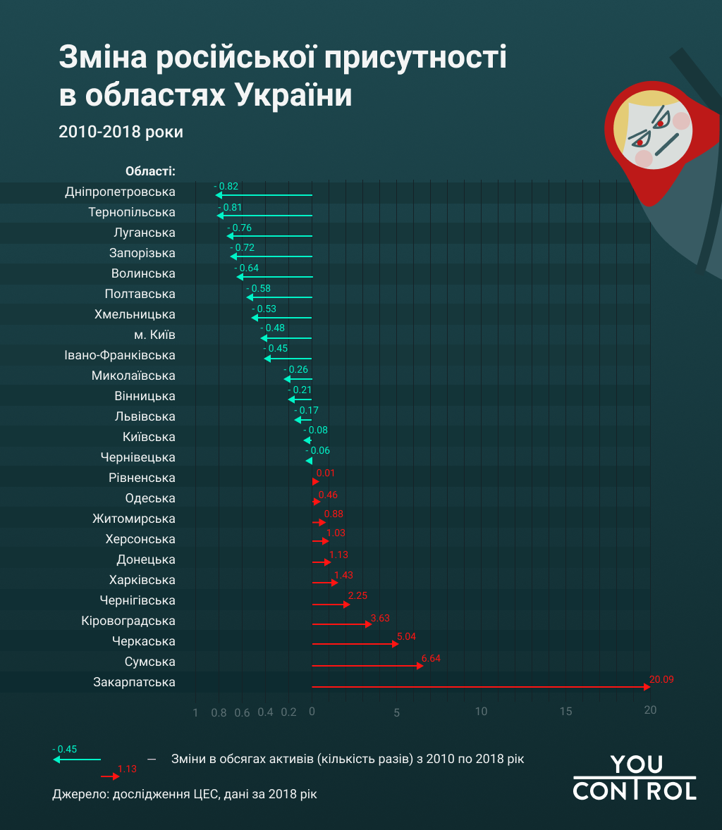 По данным ЦЭС, последние 10 лет российское присутствие в Западной Украине упало (кроме Закарпатской области), а выросло больше всего в Закарпатской, Сумской, Черкасской, Кировоградской и Черниговской областях.
