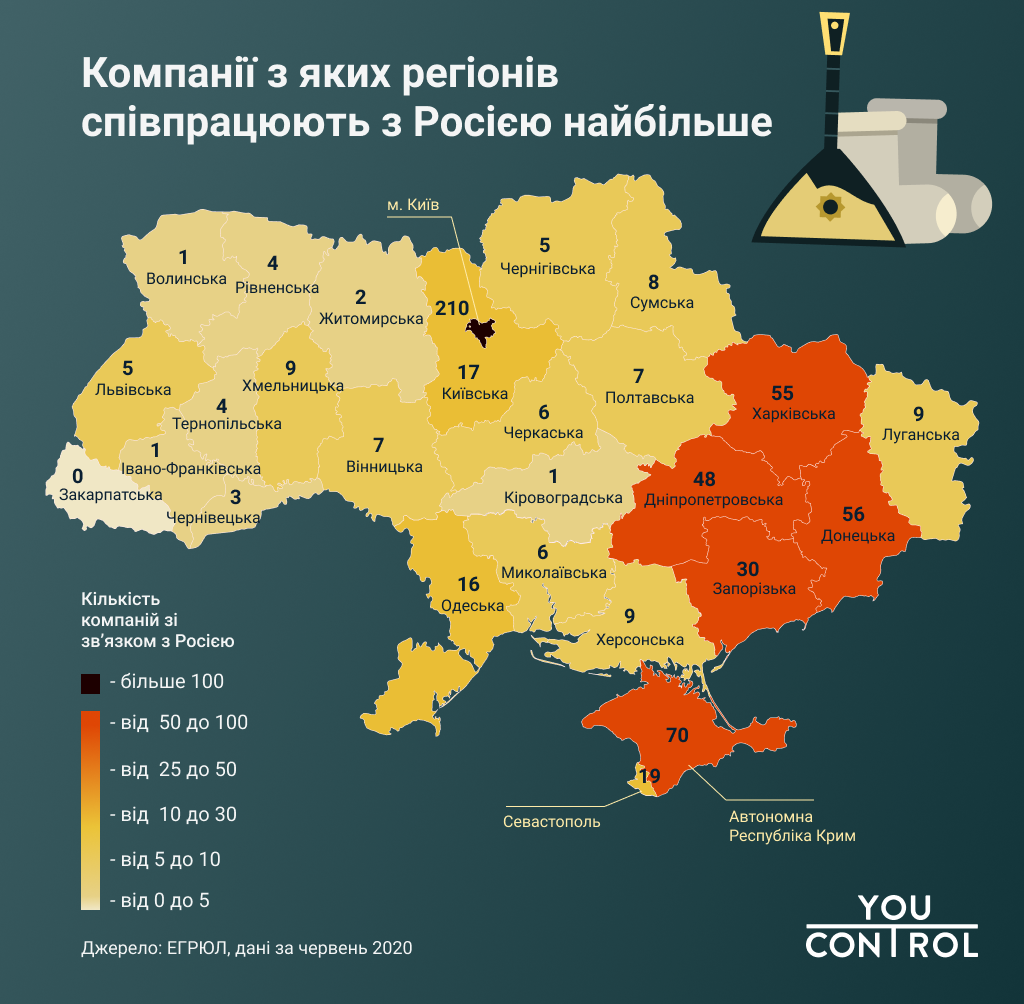 При этом в Западной Украине почти отсутствуют компании, которые являются учредителями юрлиц в РФ. Так, в Ивано-Франковской, Волынской, Тернопольской и Закарпатской областях только по одной такой компании, в Хмельницкой — 2, в Черновицкой — 3, в Ровенской — 4, а во Львовской — 5”, — заявляют в YouControl.