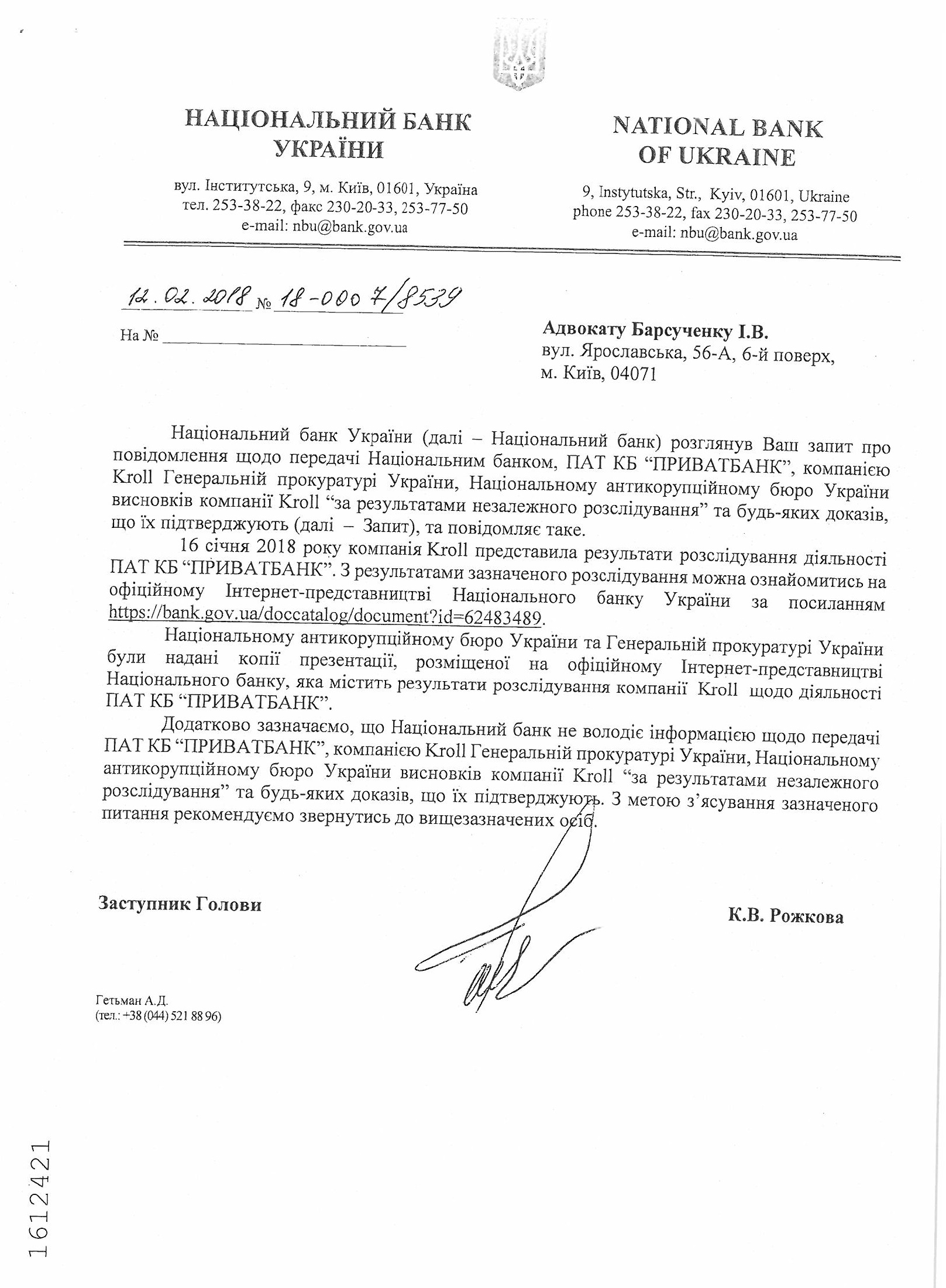 "Национальный банк не владеет информацией о передаче ПАО КБ "Приватбанк", компанией Kroll Генеральной прокуратуре, НАБУ выводов компании Kroll "по результатам независимого расследования " и каких-либо доказательств, которые его подтверждают", - говорится в ответе регулятора за подписью заместителя главы НБУ Екатерины Рожковой.