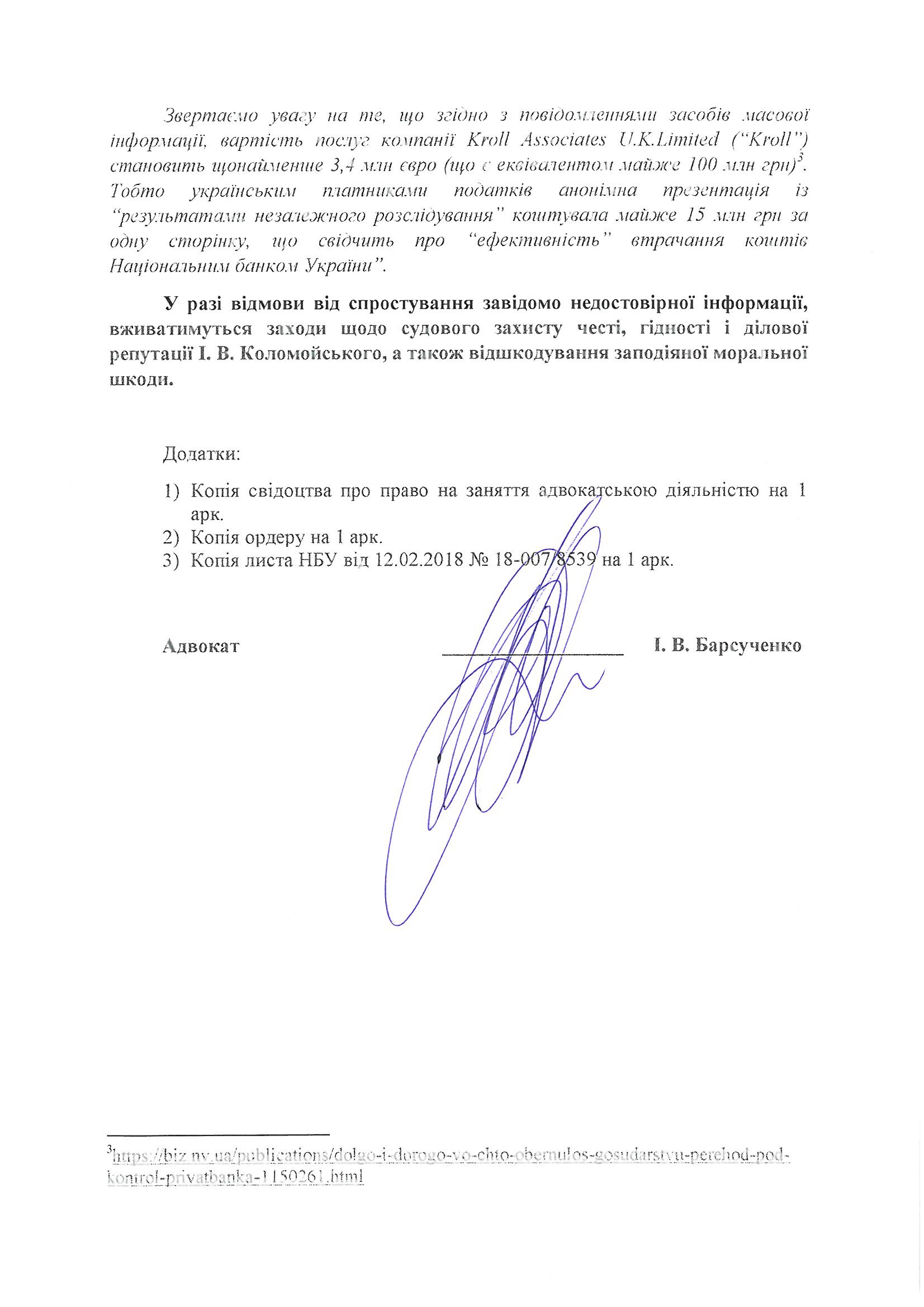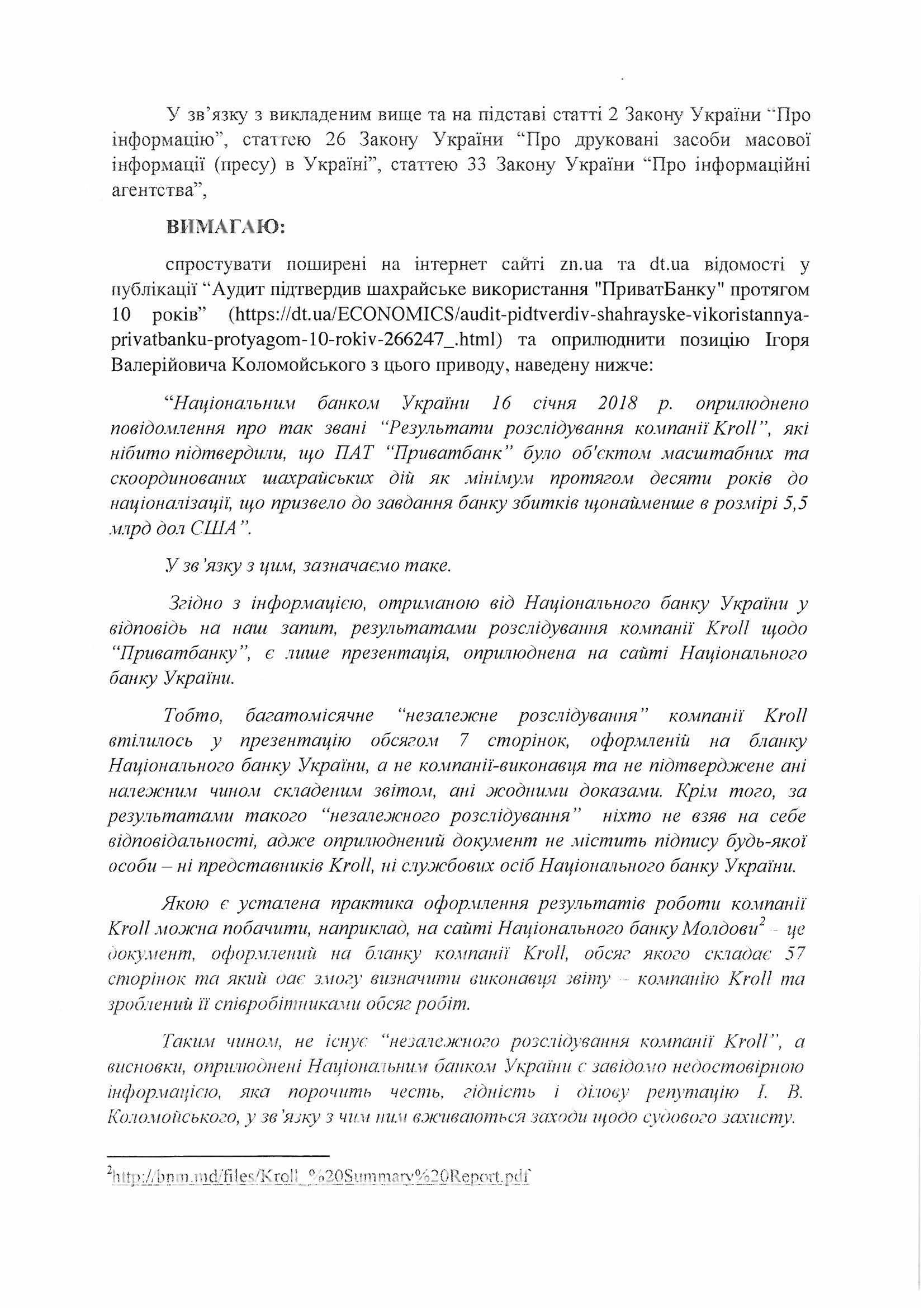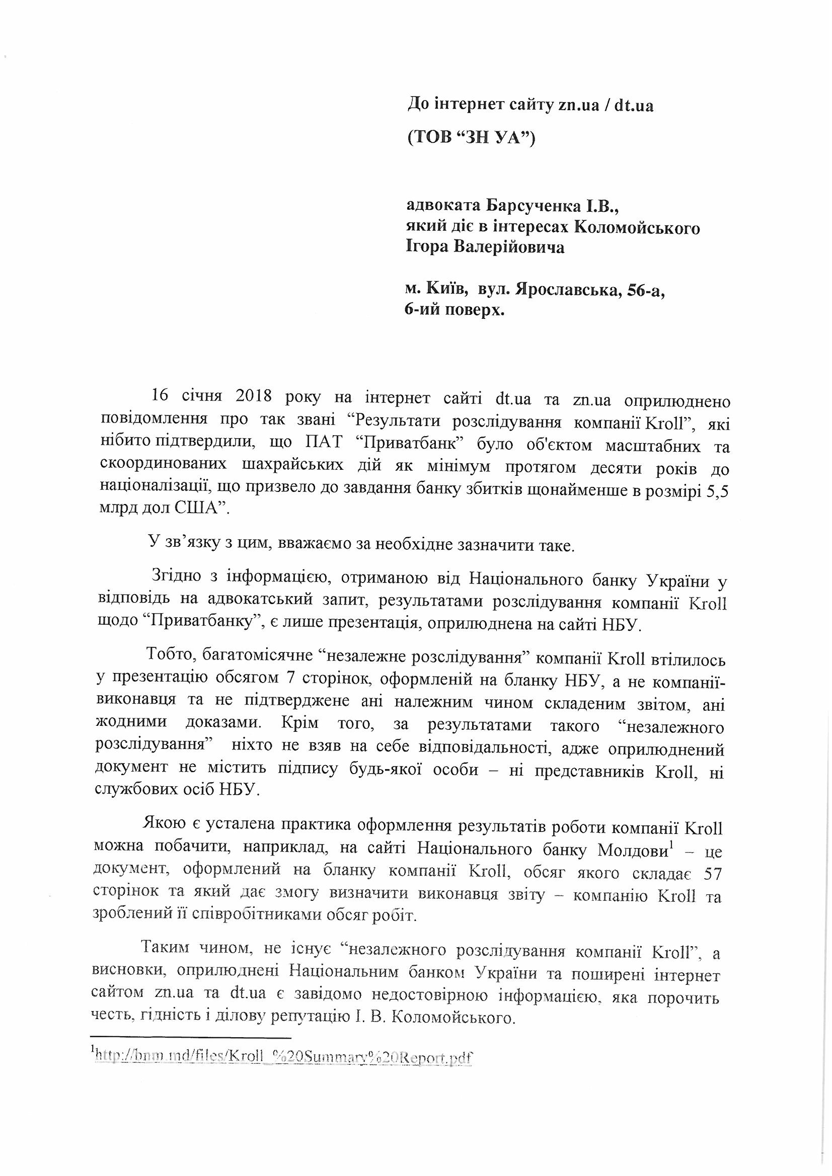 Таким образом, не существует "независимого расследования компании Kroll", а выводы, обнародованные Национальным банком Украины заведомо недостоверной информации, порочащей честь, достоинство и деловую репутацию И.В. Коломойского, в связи с чем им принимаются меры по судебной защиты.