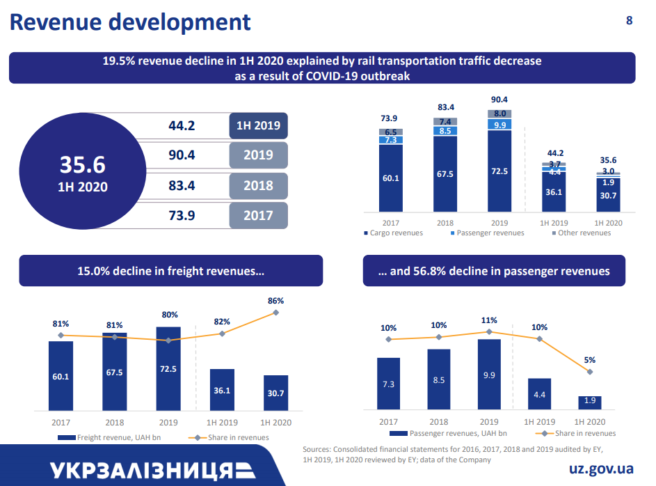 При этом чистый доход УЗ от реализации продукции (товаров и услуг) составил 35,623 млрд грн (сокращение на 19,42% по сравнению с аналогичным периодом 2019 года). Себестоимость реализованной продукции достигла 37,303 млрд грн (39,649 млрд грн в первом полугодии 2019 года). Затраты на оплату труда в первом полугодии 2020 года сократились на 4,75% по сравнению с аналогичным периодом прошлого года, составив 17,082 млрд грн против 17,934 млрд грн. Валовой убыток за отчетный период составил 1,68 млрд грн против 4,5578 млрд грн валовой прибыли в январе-июне 2019 года.