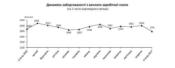 Задолженность работникам экономически активных предприятий в декабре 2016 года уменьшилось на 16,0%, или на 212,7 млн грн, и на 1 января 2017 года составляла 1118,2 млн грн.