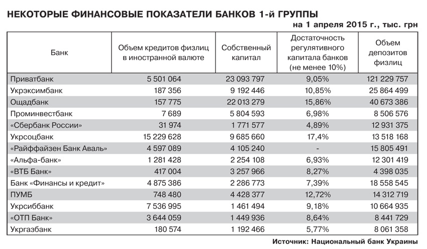 Кредиты распределены между банками неравномерно, и для некоторых из них выполнение норм принятого закона может стать последним гвоздем в крышку гроба. Среди банков, лидирующих по объемам валютных кредитов, - Укрсоцбанк (15,2 млрд грн), Укрсиббанк (7,5 млрд), Банк "Финансы и кредит" (4,8 млрд), Приватбанк (5,5 млрд), "Райффайзен Банк Аваль" (4,5 млрд), "ОТП Банк" (3,6 млрд грн).