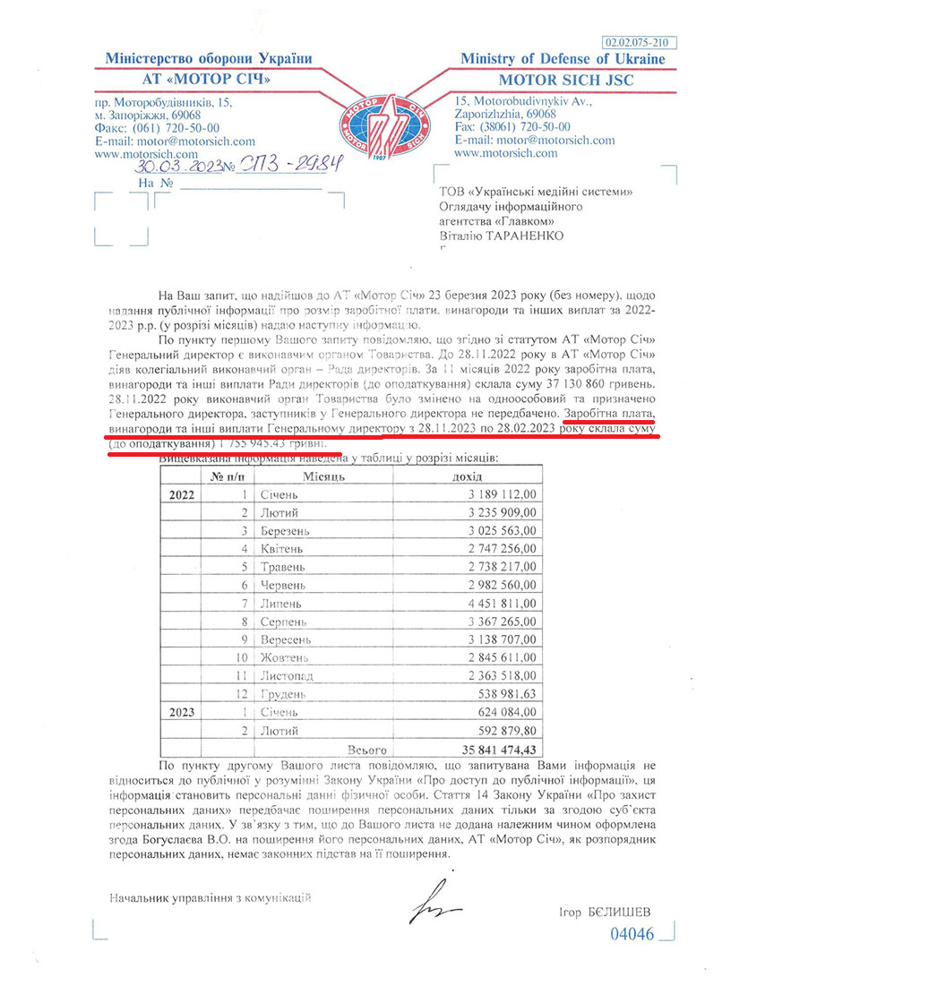 На предприятии лишь отметили, что за 11 месяцев 2022 года Совет директоров акционерного общества «Мотор Сич» заработал 37,13 млн грн. Сюда вошли заработная плата, вознаграждение и другие выплаты.