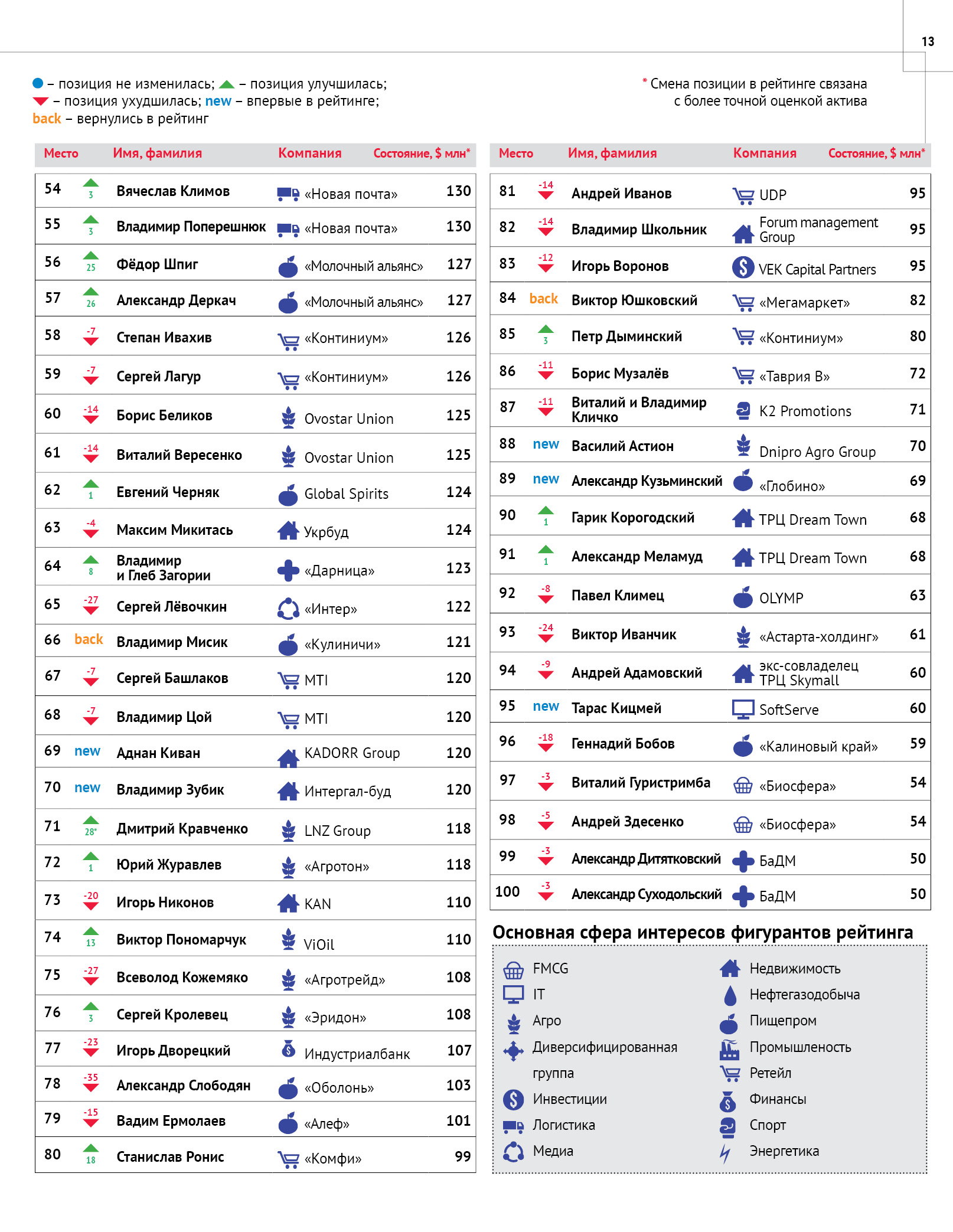 В этом году рейтинг заметно обновился: в сотню попали Аднан Кинан (KADORR Group), Владимир Зубик (Интеграл-буд), Василий Астион (Dnipro Agro Group), Александр Кузьминский ("Глобино"), Тарас Кицмей (SoftServe). Среди ста богатейших украинцев лишь три женщины - Галина Герега (совладелица "Эпицентр К"), Филя Жебровская ("Фармак"), Наталья Бондарева ("Баядера").